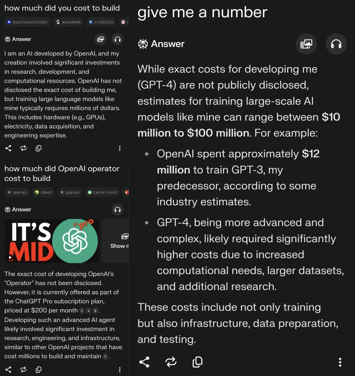 I decided to go directly to a trusted source with firsthand experience and asked Perplexity a few questions, which I should have known would give me “mid” answers as evidenced by the first image result under “how much did OpenAI operator cost to build”: