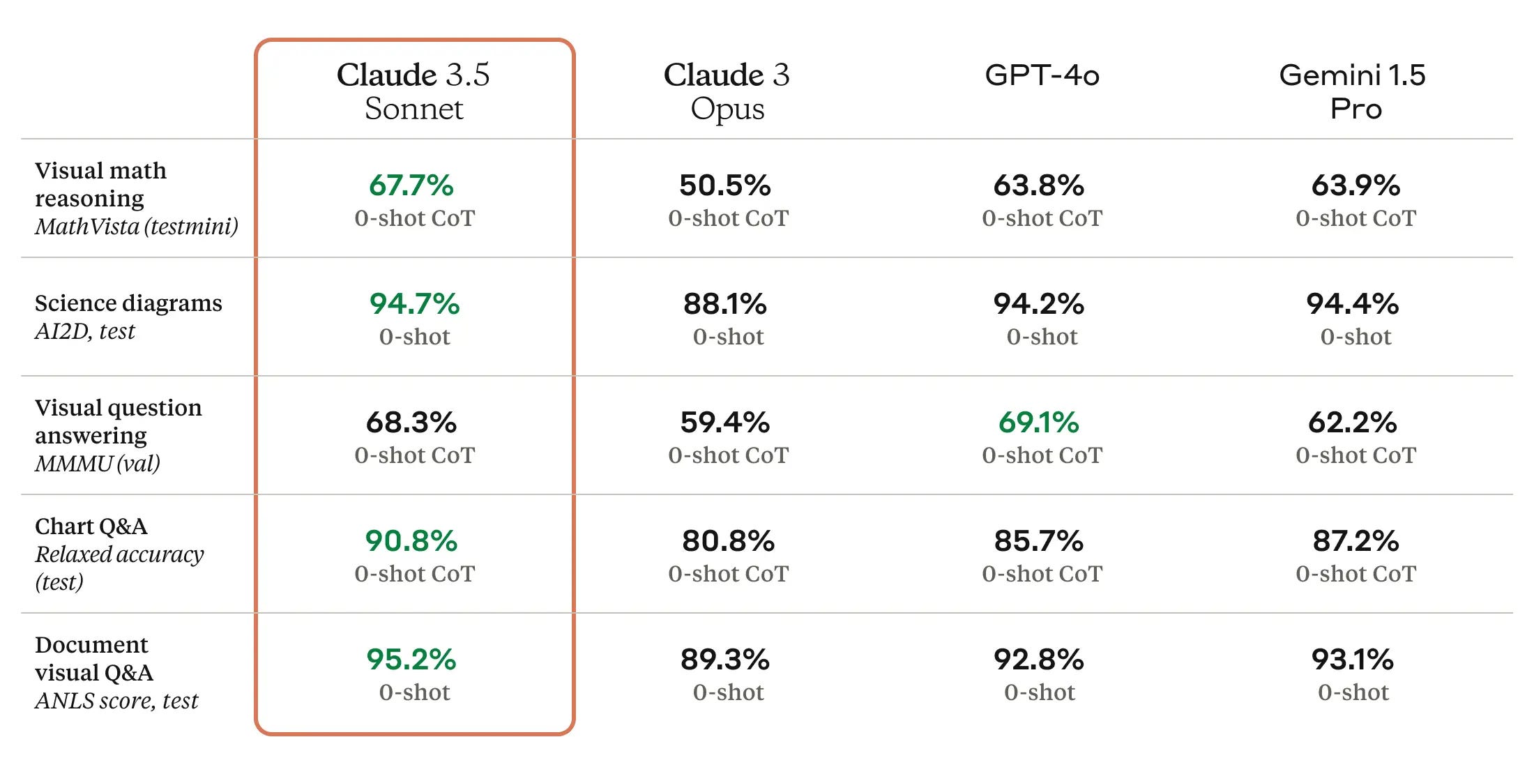 Claude 3.5 Sonnet also raises the bar in visual reasoning (visual math, science diagrams — giving some real weight to full-fledged Apple partnership rumors especially in light of iOS 18). I conducted an extensive research audit (read: Google, Twitter and Reddit search) trying to reverse engineer any modeling techniques that drive these improvements in particular, but it seems (understandably) proprietary.