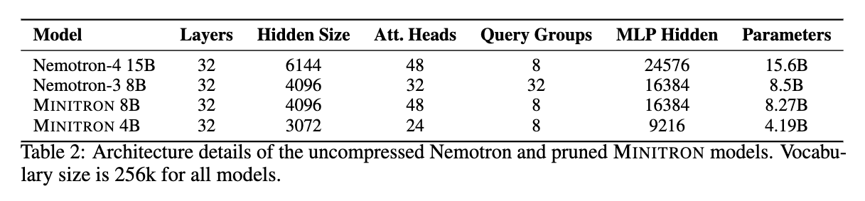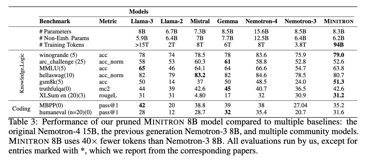 They are able to compress Nemotron-4 15B to 8B and 4B parameters (Minitron). Overall, they are able to achieve 1.8x cost saving (based on FLOP count) with approximately similar model performance, with some possible areas of improvement in coding tasks, and highlight best practices learned during this work.