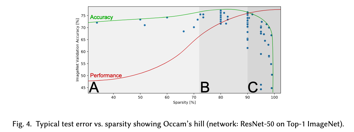 Generalization is “how well the model performs for unseen data drawn from the same distribution as the training data but was not used for training”. Sparsification follows Occam’s hill where, as we start to sparsify, accuracy increases because we aren’t learning as much noise, and performance as well as a sparser model forces a “stronger regularizer”. Performance plateaus as sparsity increases, until we hit a breaking point where accuracy drops off significantly as the model becomes too crude.