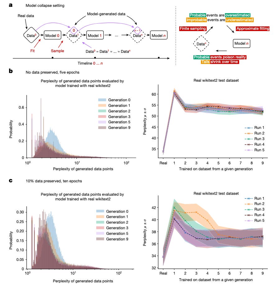 Model collapse is a degenerative process affecting generations of learned generative models, in which the data they generate end up polluting the training set of the next generation. Being trained on polluted data, they then mis-perceive reality […] We separate two special cases: early model collapse and late model collapse. In early model collapse, the model begins losing information about the tails of the distribution; in late model collapse, the model converges to a distribution that carries little resemblance to the original one, often with substantially reduced variance.