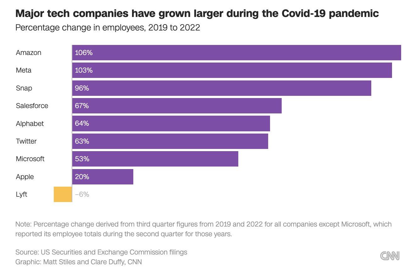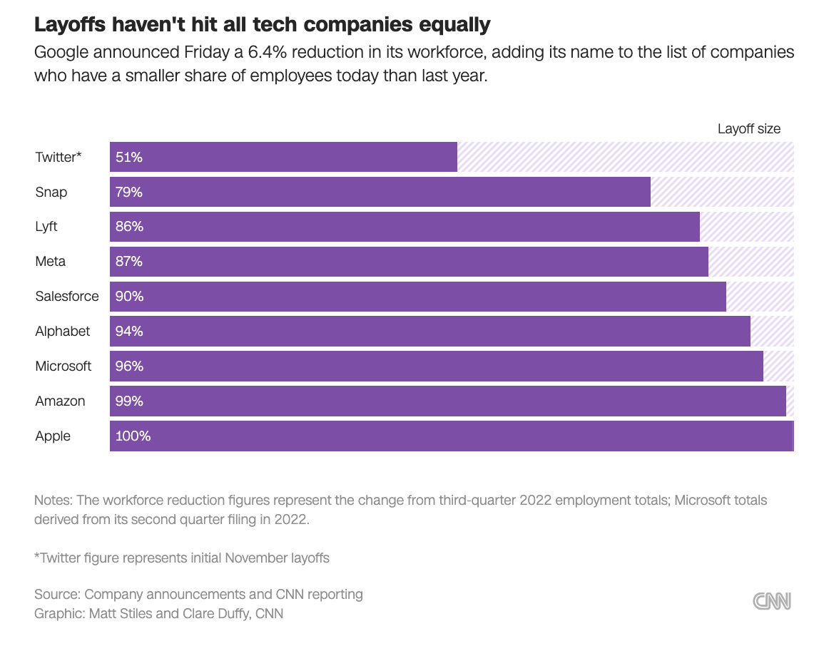 In 2023 many companies announced major layoffs, although CNN called out at time of publication that Apple grew its staff by only 20% from 2019 to 2022 and had not announced layoffs: